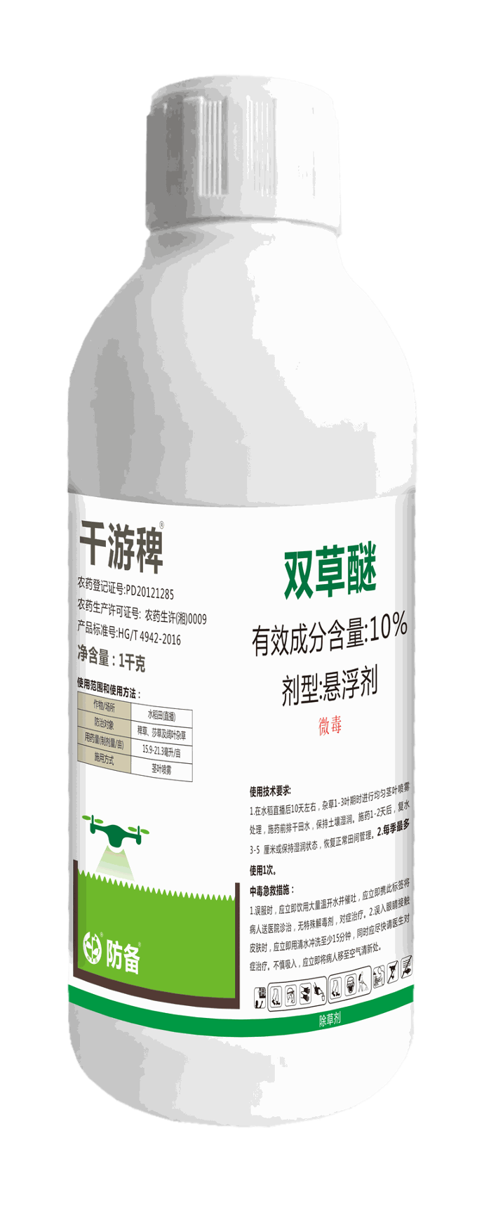 千游稗"属于嘧啶类水杨酸类除草剂,经过茎叶吸收传导至整个植株,抑制杂草分生组织生长,从而杀死杂草。用于防治水稻直播田稗草,双穗雀稗、稻李氐禾、陌上菜、空心莲子草、异型莎草等杂草。